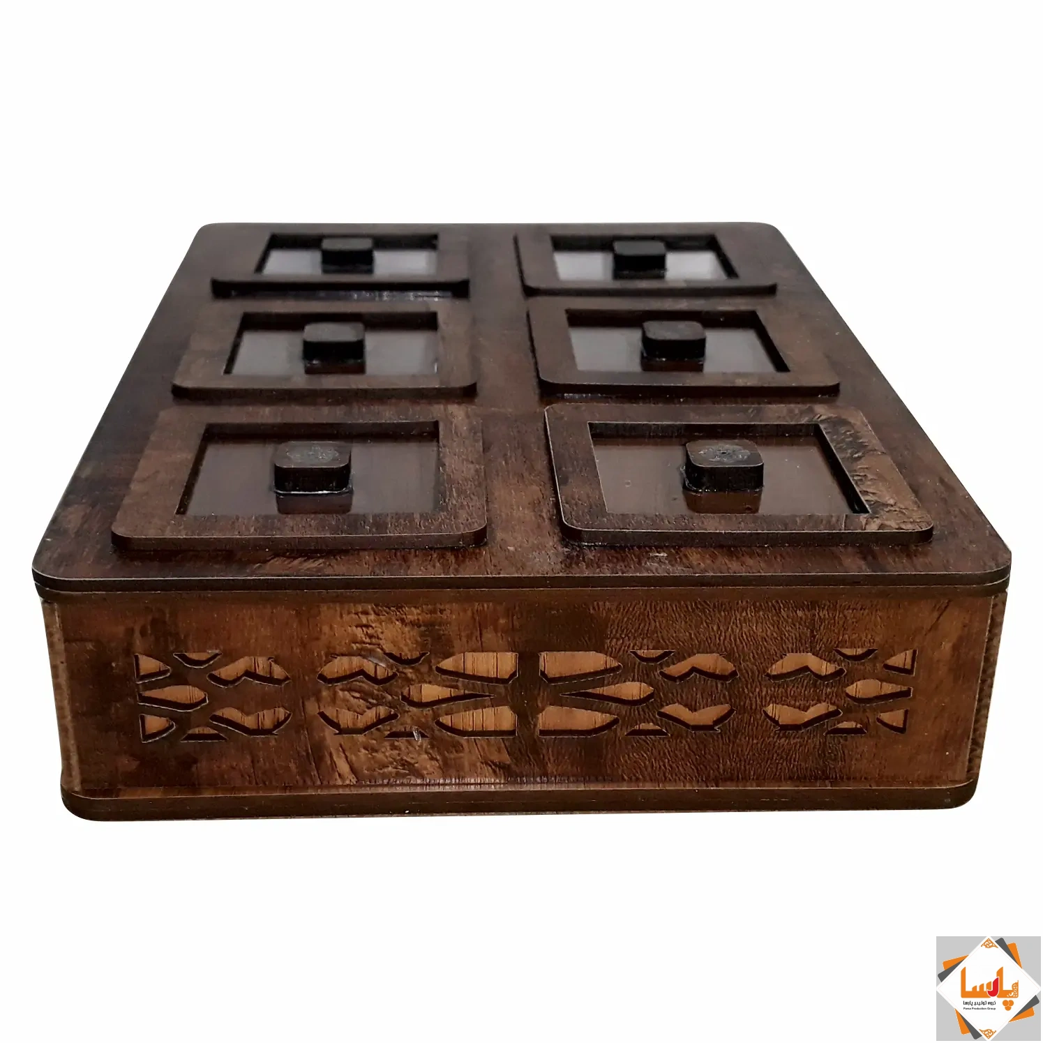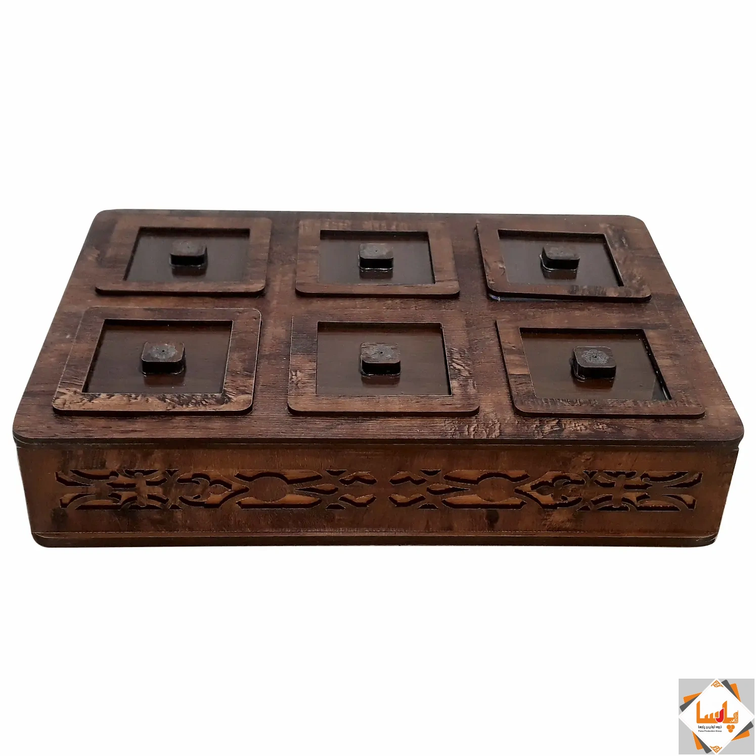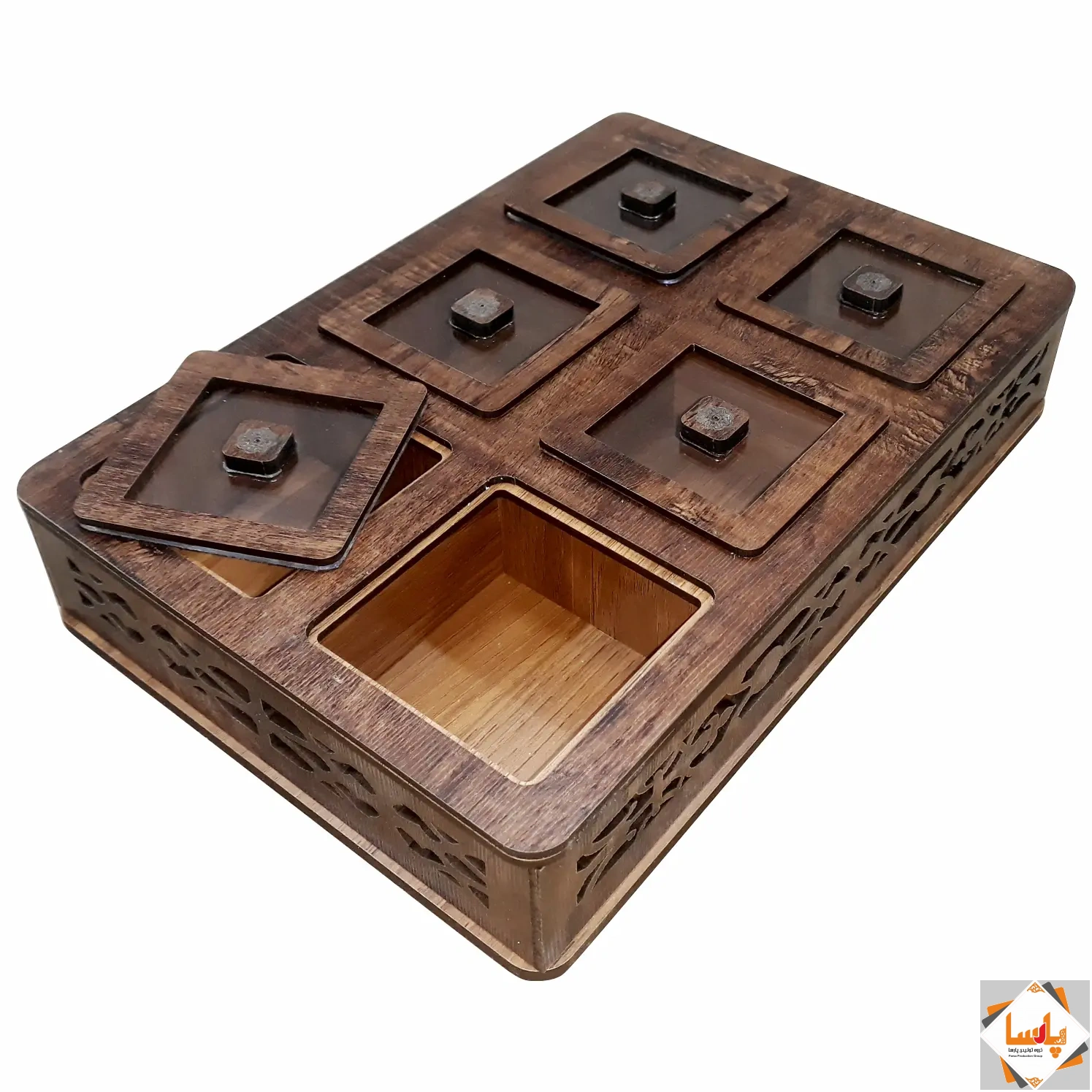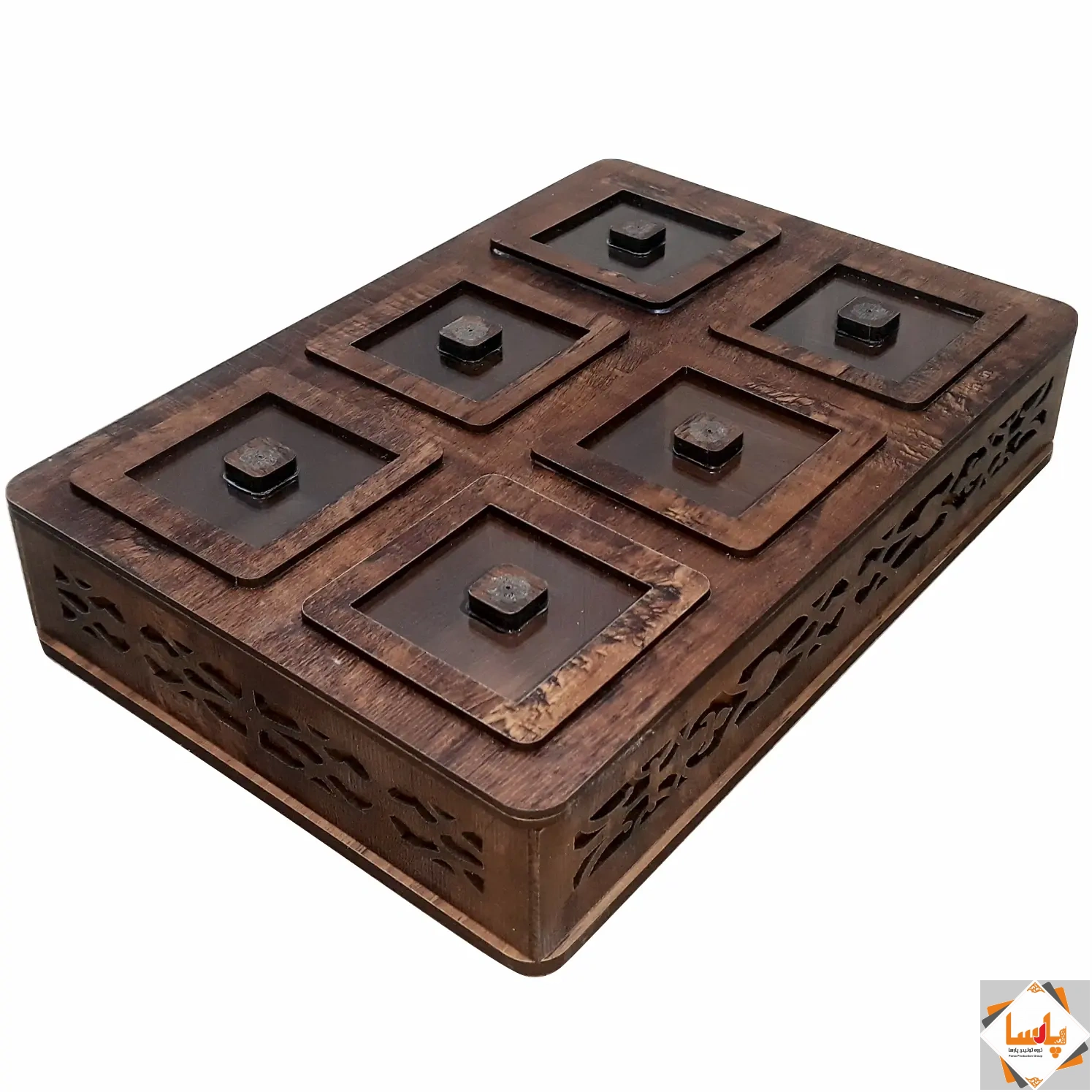 جعبه پذیرایی 6 خانه کد 041 یک وسیله بسیار زیبا جهت قرار دادن بر روی میز پذیرایی و حتی میز آشپزخانه جهت زیبا تر شدن آن می شود. همچنین به دلیل درب دار بودن هیچ مشکلی برای محتوایات داخل این جعبه پذیرایی به وجود نمی آید .
