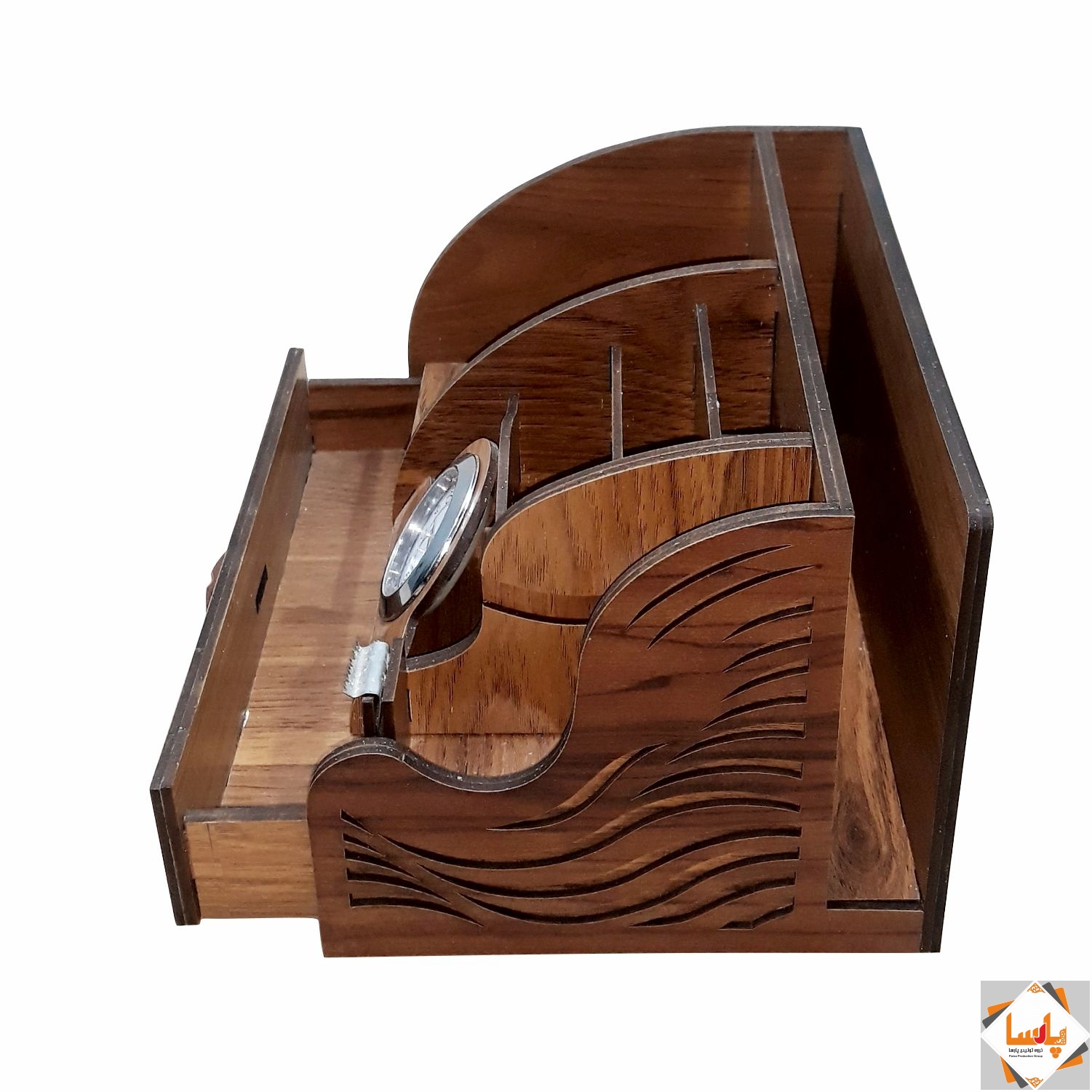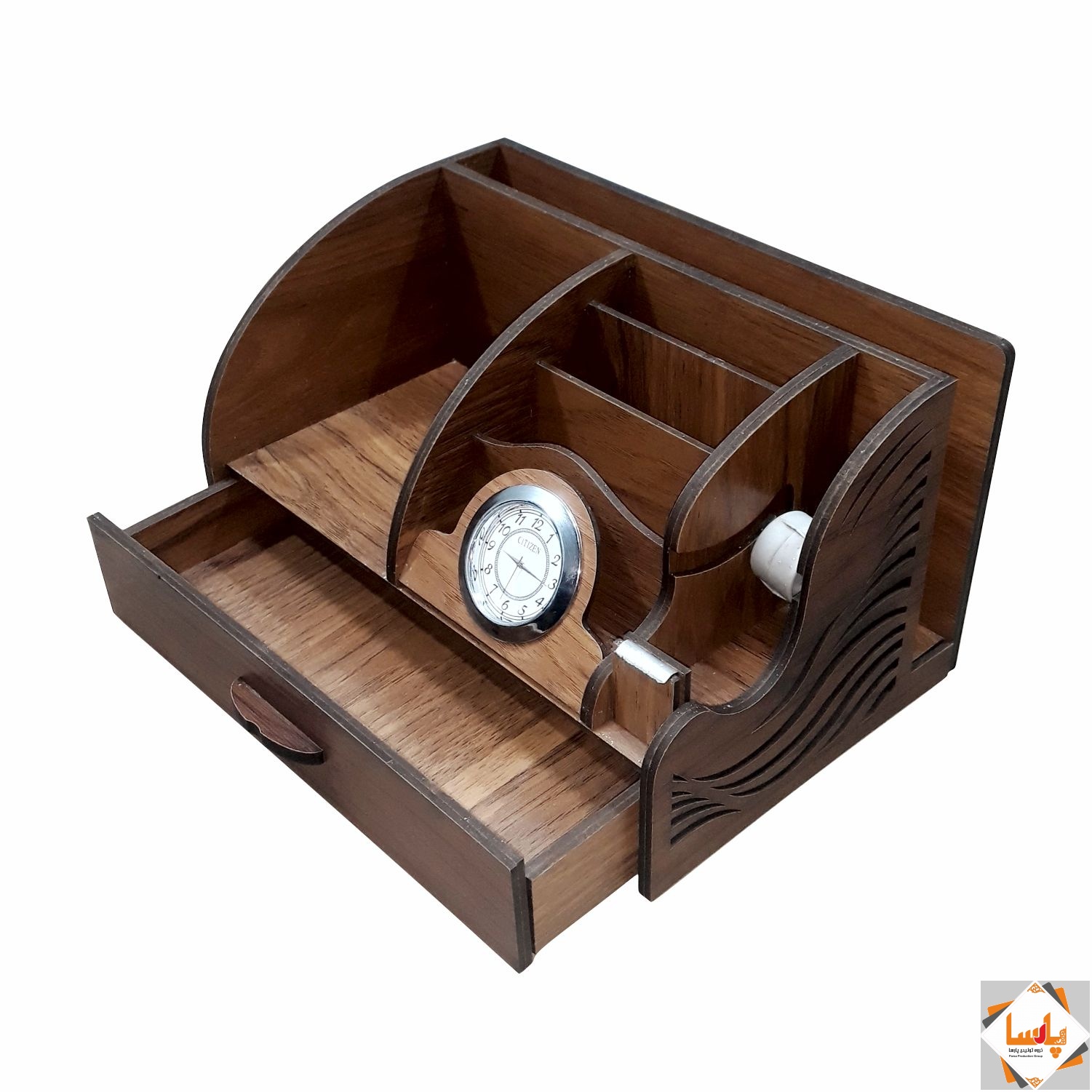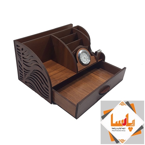 محصول پیش رو مجموعه ست اداری است که دارای جای کاغذ یادداشت ، وسایل تحریر از جمله مداد ، خودکار ، ماژیک و … ، جای کارت ، جای پاکت ، جا چسبی و ساعت می باشد. همچنین یک کشو دارد که وسایل کوچک را می توان در آن قرار داد. روکش بیرونی کار از جنس ملامینه و با کیفیت تولید بالا است.
